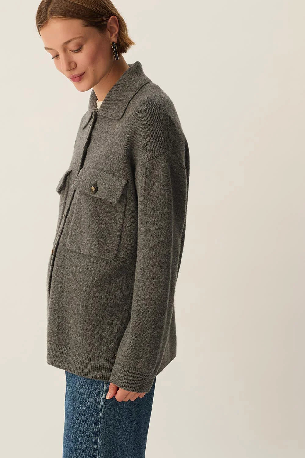Mit ihrem weiten Schnitt und den großen Pattentaschen verbindet Dorette den Komfort einer Wollweste mit dem ikonischen Look einer Safarijacke. Ein gewagtes Kleidungsstück, das sich über einen Rock oder eine Jeans tragen lässt und für einen entschieden zeitgemäßen Look sorgt.