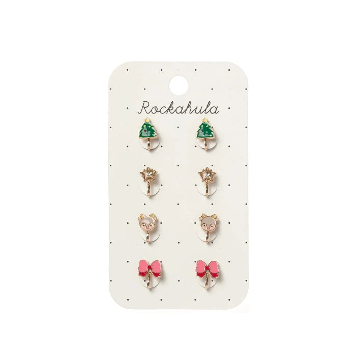 Verleihen Sie Ihrem Outfit mit diesem Set Clip-Ohrringen einen Hauch von Weihnachtsstimmung. Dieses festliche Viererpack enthält kleine Rentiere, Weihnachtsbäume, funkelnde Edelsteine und süße rosa Schleifen – alle auf goldenen Metallclips befestigt. Jedes Stück lässt sich sanft anstecken (keine Ohrlöcher erforderlich) und wurde speziell für kleine Ohren entwickelt!