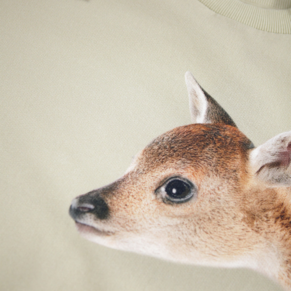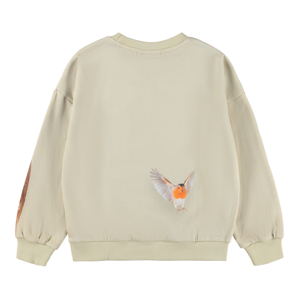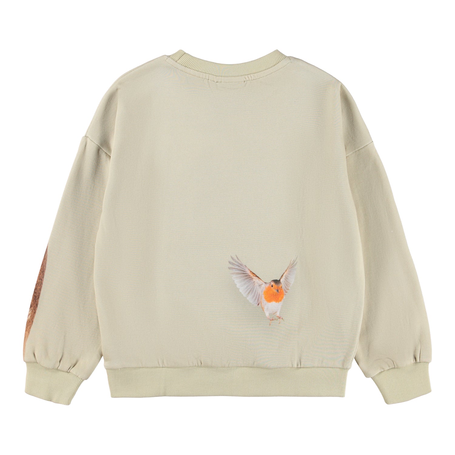Ecrufarbenes Sweatshirt aus Öko-Baumwolle. Das Sweatshirt hat eine lockere Passform, einen Rundhalsausschnitt, gerippte Abschlüsse und einen Aufdruck von Waldtieren.