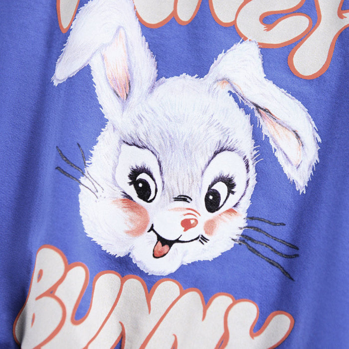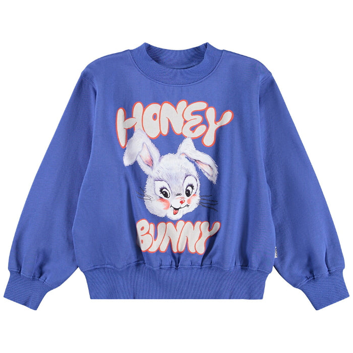 Blauer Sweatshirt aus Öko-Baumwolle mit einem niedlichen, gezeichneten Hasen und dem Text ''Honey Bunny'' bedruckt. Der Sweatshirt hat einen Rundhalsausschnitt mit gerippten Abschlüssen an den Ärmeln, am Hals und am Saum sowie eine lockere Passform.