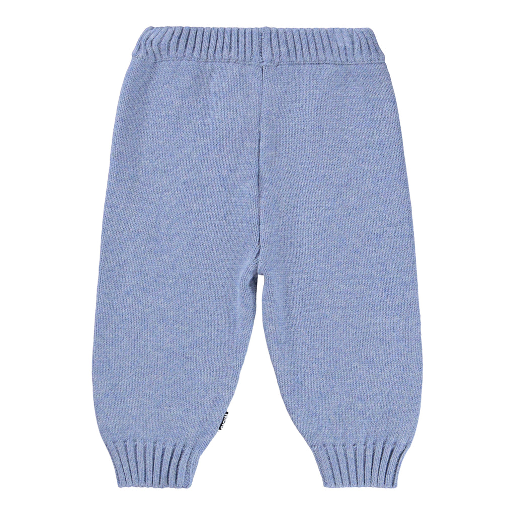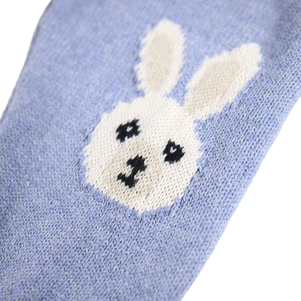 Hellblaue Hosen für die Kleinen aus einem weichen Rippenstrick aus Baumwolle und Wolle mit einem Kaninchen und einem Elefanten auf den Knien. Die Hosen haben einen elastischen Bund, um sie leicht an- und ausziehen zu können, sowie gerippte Bündchen an den Knöcheln. Kombinieren Sie sie mit dem passenden Pullover für ein komplettes Set.