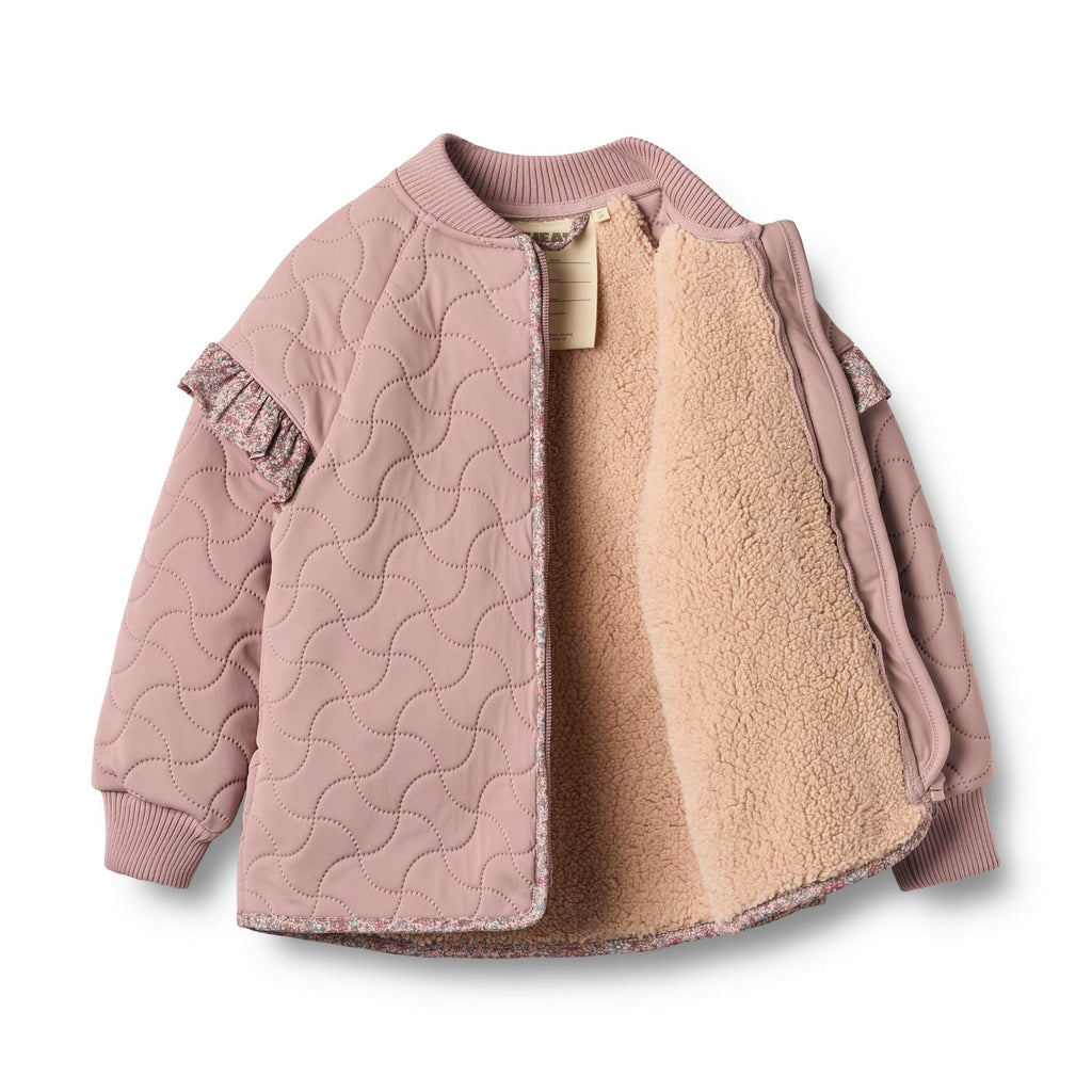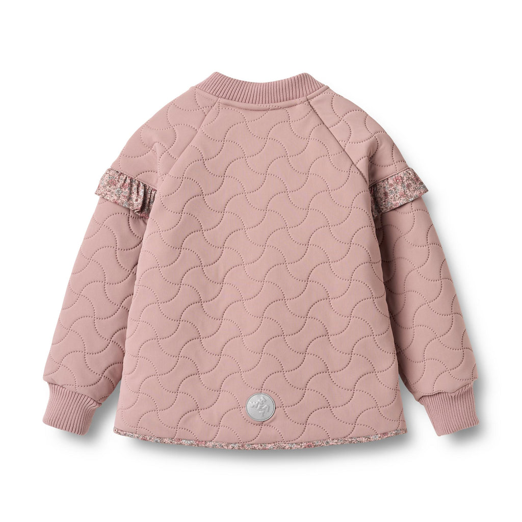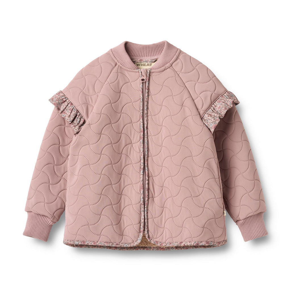Schöne Wheat-Thermojacke in warmem Rosa mit kleinblumigen Schultern, Rüschen an den Schultern und Kanten in hellblauen, grünen, weißen und rosa Farbtönen. Die Thermojacke hat eine gesteppte Struktur.