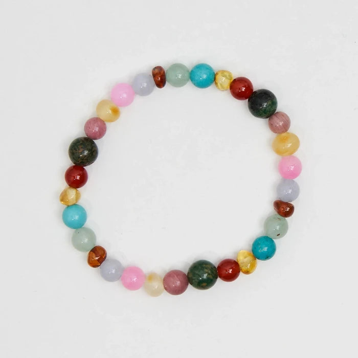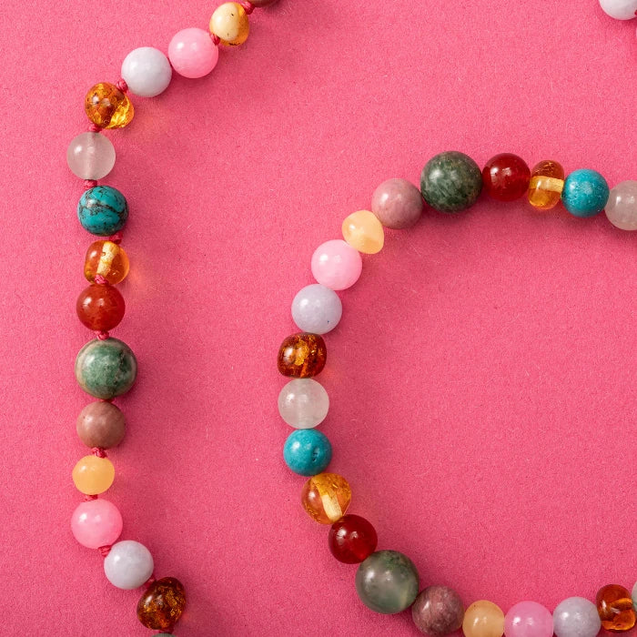 Grüne afrikanische Jade, rosa Jade, grüner Aventurin, Karneol, Türkis, Aquamarin, Rhodokrosit und Bernstein .