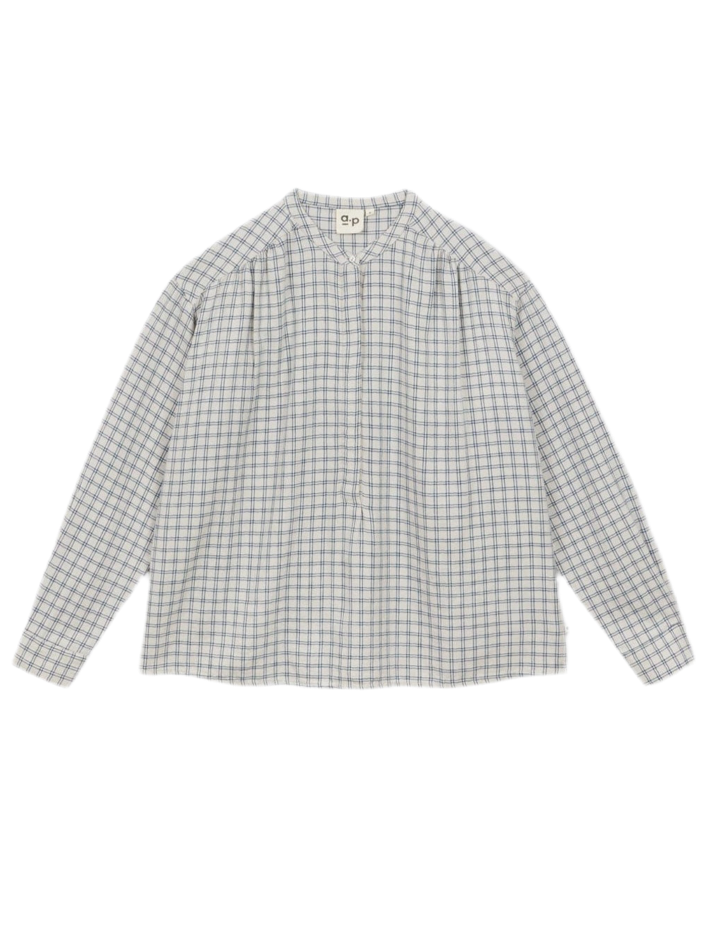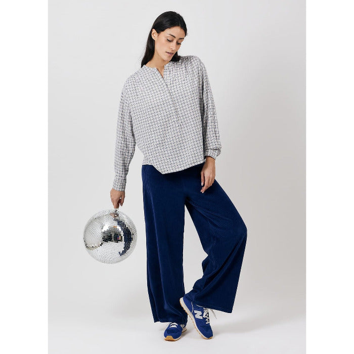 • Thérèse ist 1,78 m groß und trägt die marineblaue Bluse in Größe S.