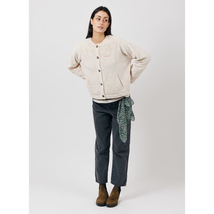 Beigefarbener Damencardigan mit Melange-Effekt.