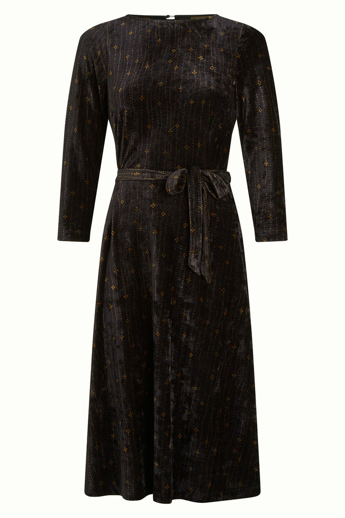 Das Joyce Dress Nieve aus weichem Viskose-Jersey-Samt mit angenehmem Stretchanteil verfügt über ein Blumenmuster, 3/4-Ärmel und einen Rundhalsausschnitt. Es hat einen Bindegürtel für eine vorteilhafte Passform und einen Knopfverschluss mit Schlüssellochausschnitt für einen zarten letzten Schliff.