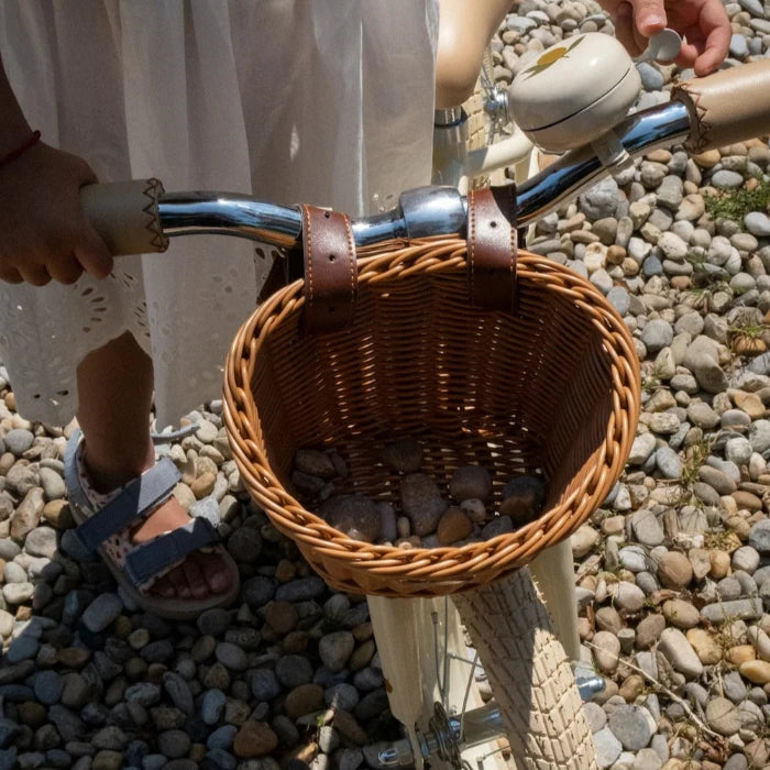 Velokorb aus Weide. Entworfen mit zwei Riemen zur einfachen Befestigung an Fahrrädern und Balance-Bikes. Materialien: Korb: Weide. Gurt: PU. Rückenlehne: Metall. Geeignet ab 3 Jahre+.