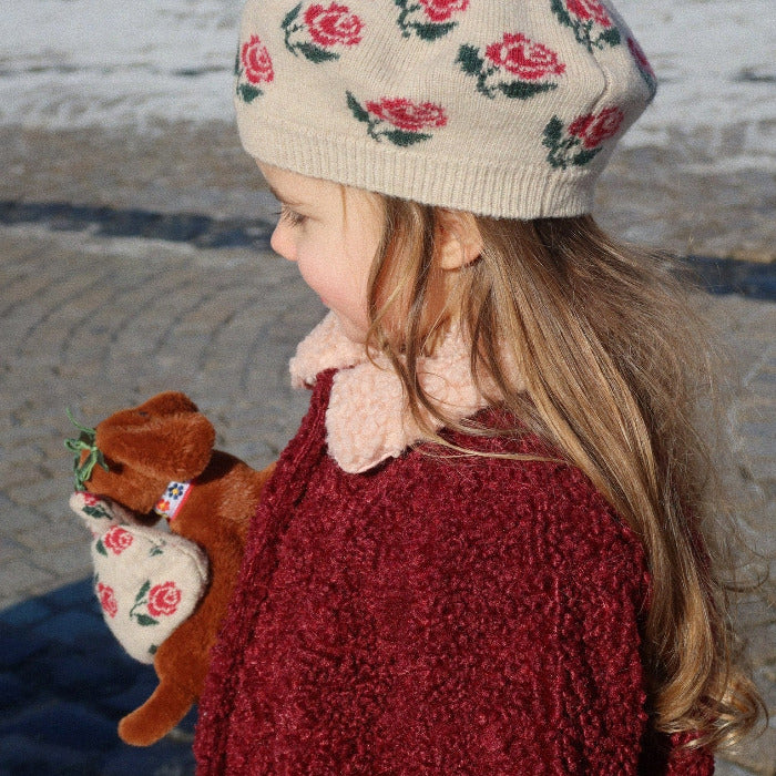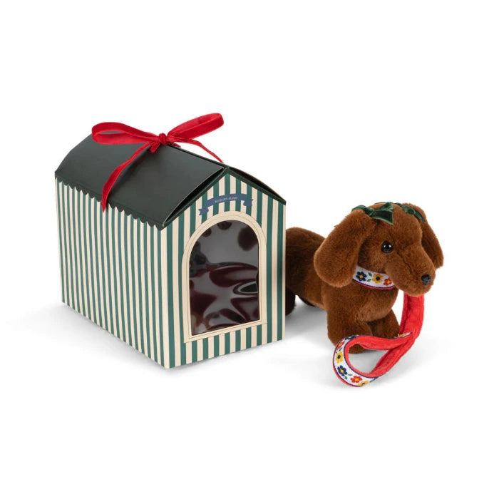 Weiches Hündchen mit eigenem kleinen Zuhause, das sich leicht transportieren lässt. Das kleine Hündchen hat auch eine eigene Leine, sodass du es überallhin mitnehmen kannst.