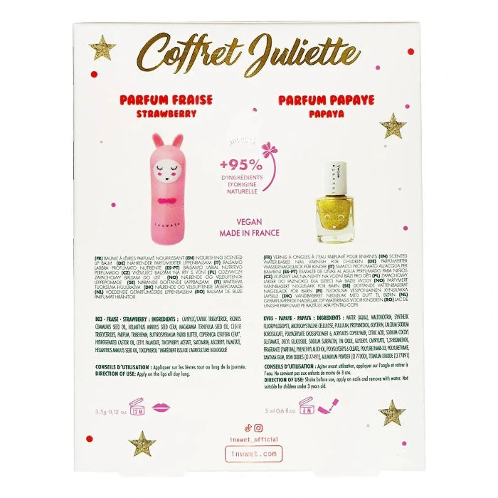 Bestehend aus einem pflegenden, farblosen Lippenbalsam mit Erdbeerduft und einem goldenen Nagellack auf Wasserbasis für Kinder mit Papaya-Duft. Der perfekte Hauch von Glitzer, um sich schön zu machen.