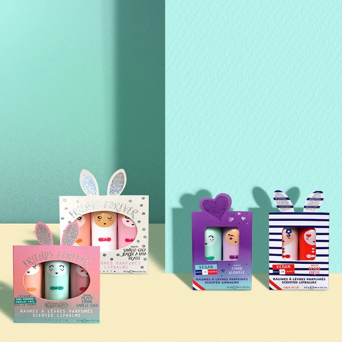 Lip Balm Trio mit Erdbeer/Marshmallow/Kirscheduft. Reich an Sheabutter und Macadamiaöl, pflegt, repariert, erweicht und schützt deine Lippen für absoluten Komfort. Formel ohne Parabene oder Allergen.