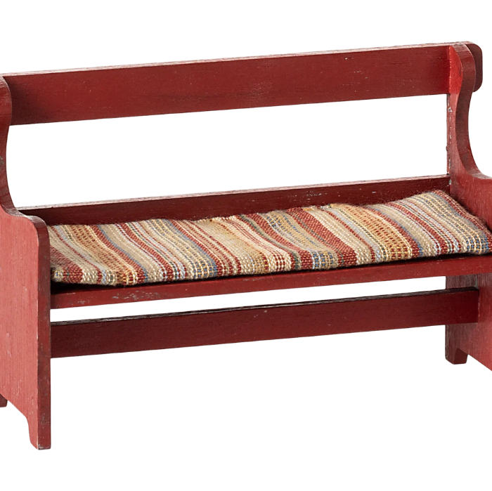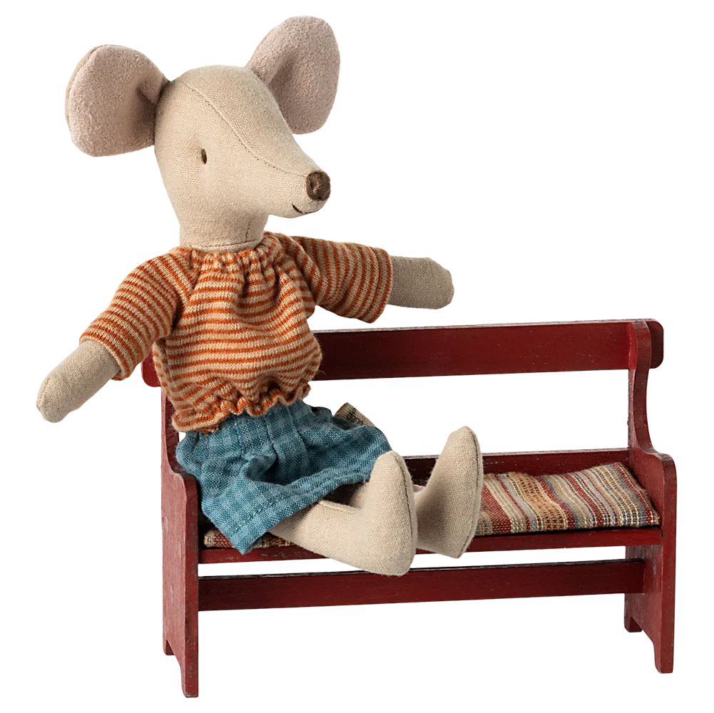 Jede Maus muss sich auch mal ausruhen und sich setzen. Vor allem die Grosseltern nehmen gerne mal Platz auf dieser gemütlichen Holzbank mit Polster und schauen den kleinen Mäuse mal beim spielen zu.