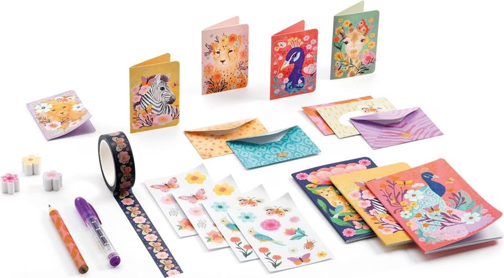 Ein Mini-Schreibwarenset mit hübschen Illustrationen. Angehende Schriftsteller werden Spaß daran haben, Ideen und Gedanken aufzuschreiben, zu zeichnen oder mit den Aufklebern zu dekorieren. Lovely Paper by Djeco, eine raffinierte, zarte Briefpapierkollektion mit hübschen Illustrationen. Eine hübsch illustrierte Schachtel. Glitzerndes Finish mit Metallic-Schimmer. Ein Produkt aus FSC®-zertifiziertem Papier und Karton. Inhalt: 1 fensterartige Schachtel (18 x 15,5 x 3 cm), 3 Mini-Hefte, 5 Mini-Umschläge, 5 Mini-Karten, 1 Klebeband, 2x 2 Stickerbögen, 1 Mini-Gelstift, 1 Mini-Bleistift, 3 Mini-Radiergummis