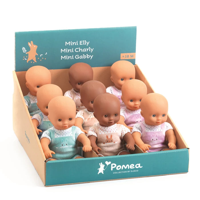 Endlich ist sie da, die Mini Puppe von Pomea. Das Einsteigermodel als Puppenmama sozusagen. Der kleine, weiche Puppenkörper lässt sich auch von Kleinkindern gut halten.