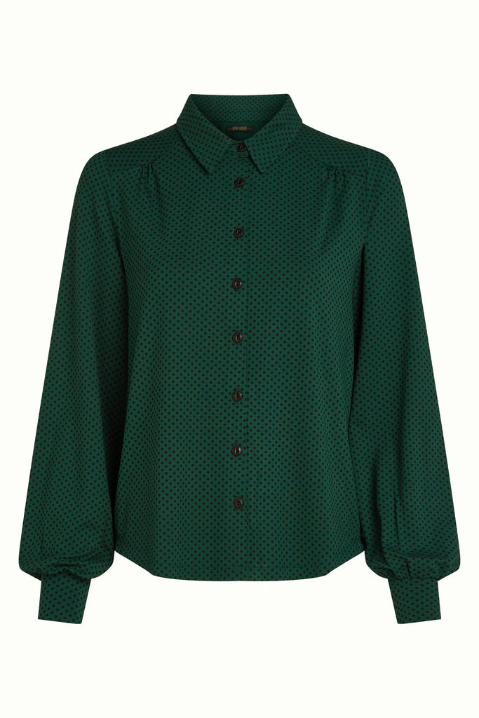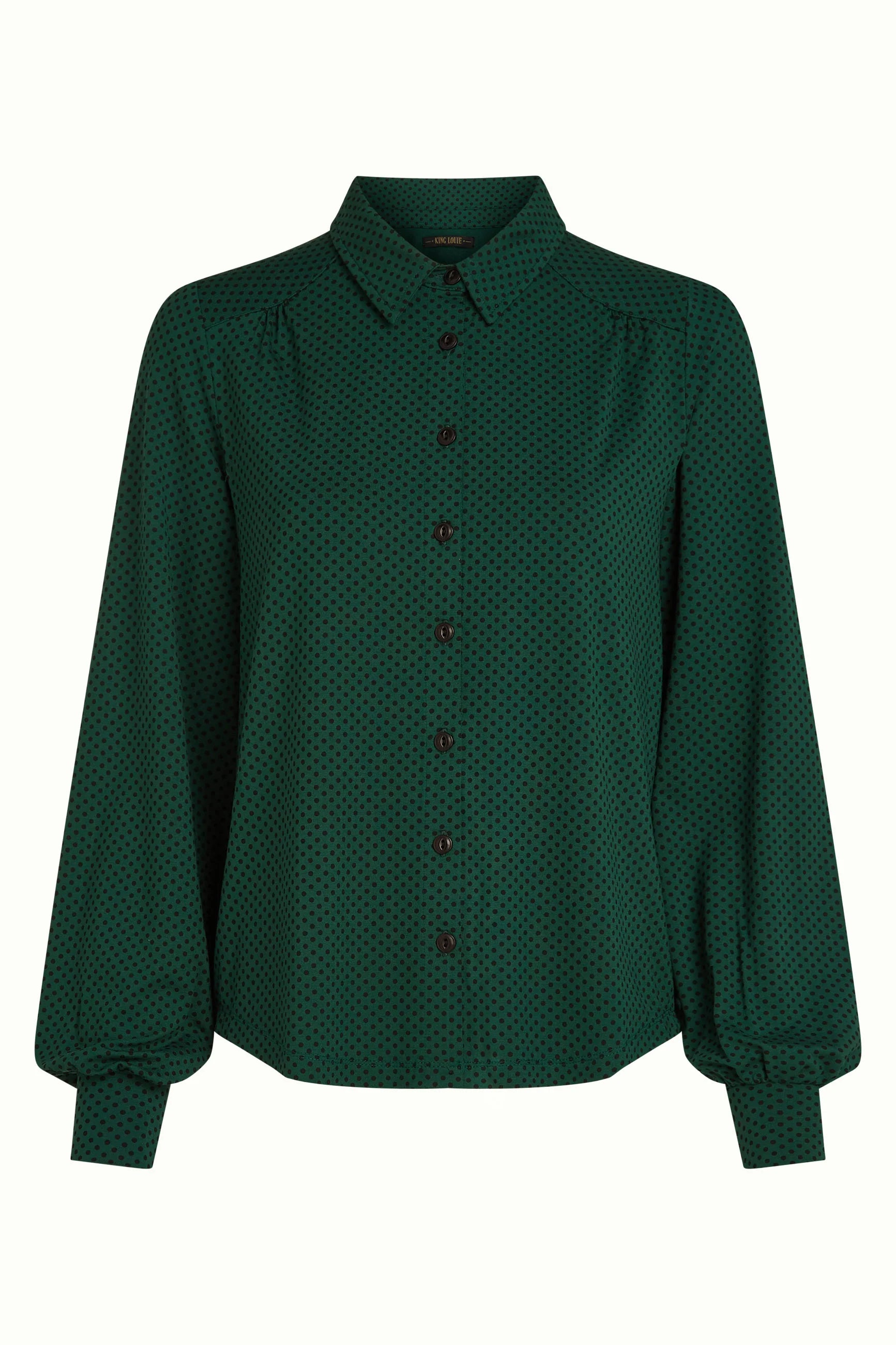 Diese Bluse verfügt über Falten entlang der Schulterpasse und der Ärmel und ist aus dehnbarem Viskose-Jersey mit einem charmanten Polka-Dot-Muster gefertigt. Sie hat lange Ärmel mit Manschetten, einen klassischen Kragen und eine Knopfleiste vorne für einen eleganten Look.