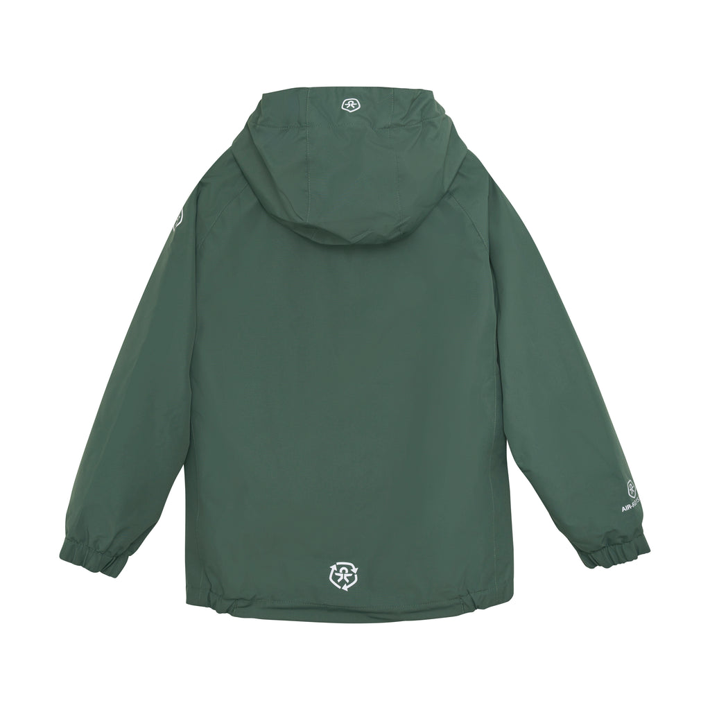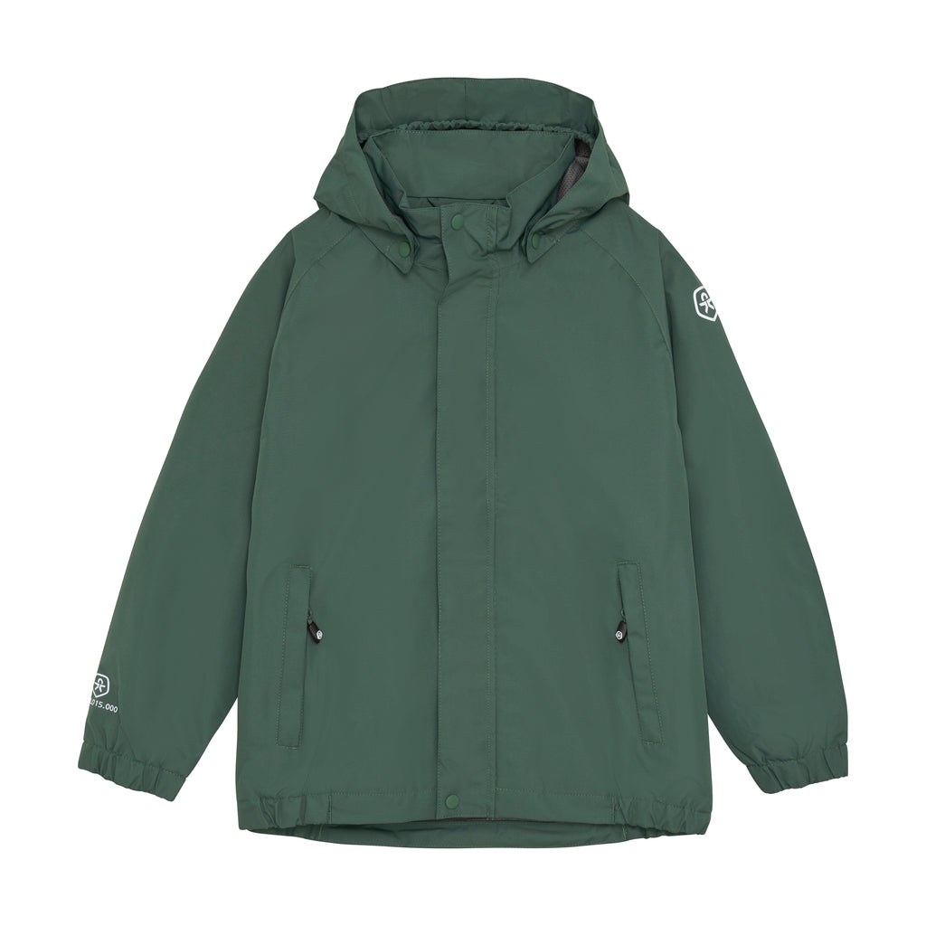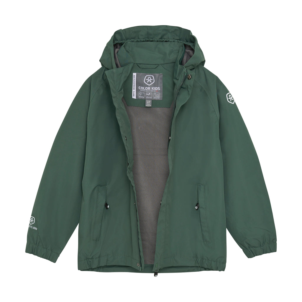 Die Shell/ Regen-Jacke von Color Kids in dunkelgrün prallt jeden Regentropfen ab. Mit verschweißten Nähten und und dem wasser- und winddichtem Stoff ist sie sehr praktisch in der nassen Jahreszeit. Sie hat viele praktische Features wie das elastische Bündchen an Handgelenk und Saum sowie eine abnehmbare Kapuze mit Druckknöpfen. Sie besitzt auch reflektierende Details. Die Shell-Regenjacke wird auf der Vorderseite durch einen Reißverschluss mit Windstangen mit Druckknöpfen geschlossen. Dieses Modell hat ein weiches Fleece-Futter im Halsausschnitt und Mesh in der Kapuze. Die Jacke ist aus einem bequemen, leichten Material mit einer sehr hohen Abriebfestigkeit gefertigt. Sie ist mit BIONIC FINISH ECO beschichtet und winddicht.