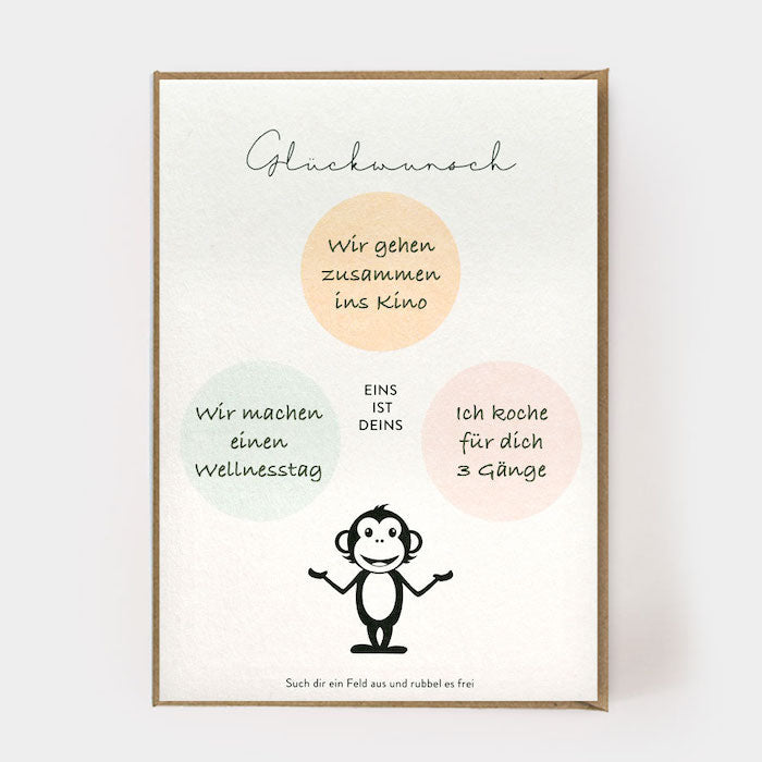 Postkarte mit Umschlag und Rubbelsticker; in Folie konfektioniert; inklusive Erklärungsaufkleber auf Vorderseite: