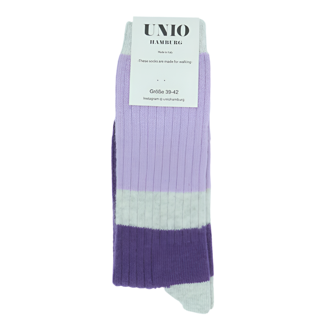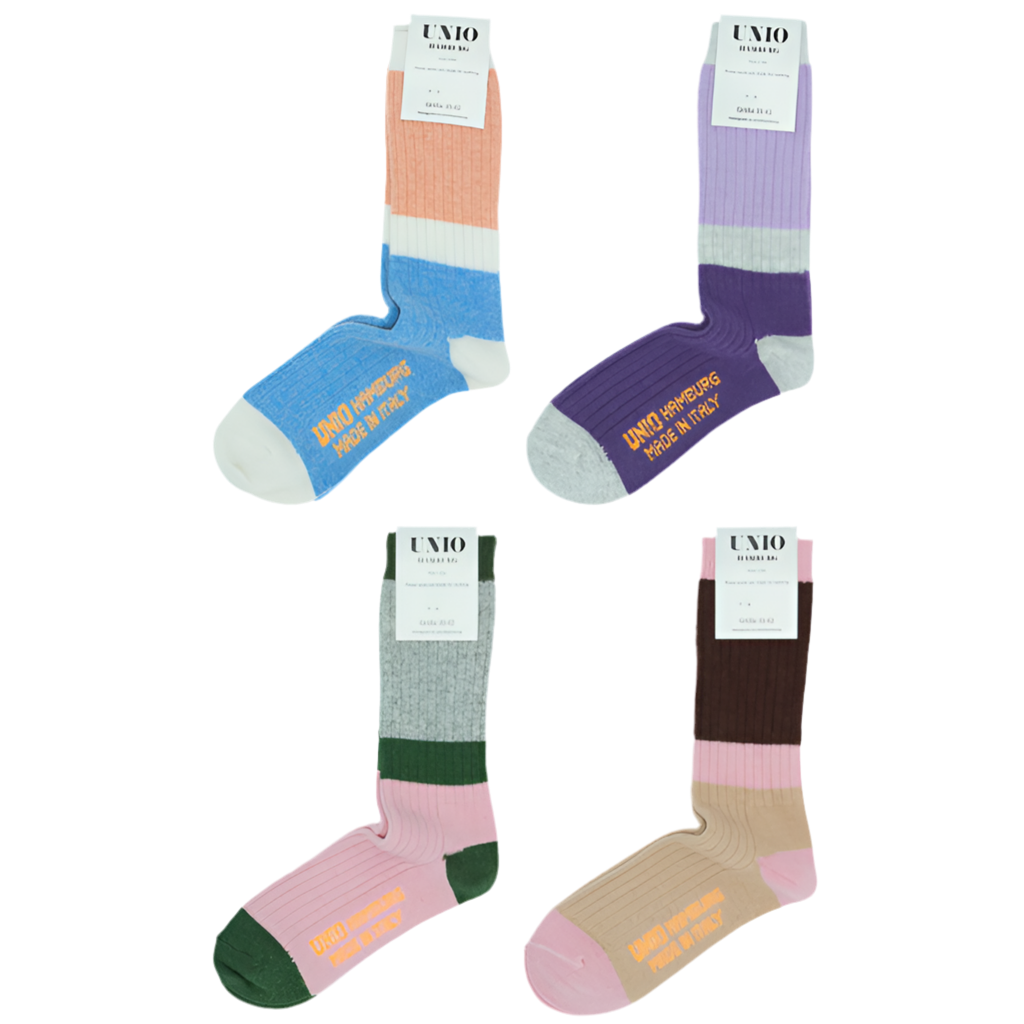 Die Socken von Unio schmiegen sich angenehm an den Fuss und sorgen durch die körpernahe Passform für ein komfortables Tragegefühl. Dank des feinen Woll-Mix mit Kaschmir-Anteil spürt man eine dezente Weichheit auf der Haut. Elastische Bündchen halten die Socken den ganzen Tag zuverlässig an Ort und Stelle.
