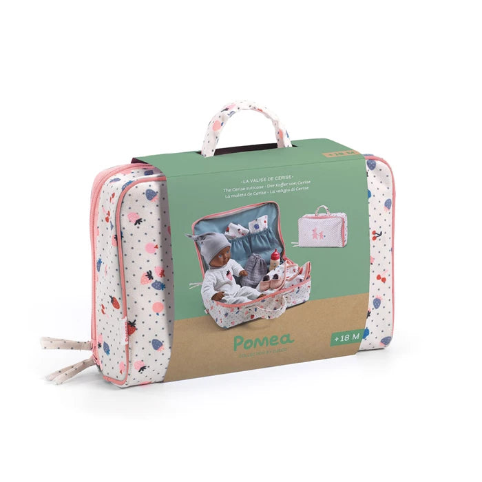 Ein hübscher Koffer "bereit zum Verschenken", um die zarte Welt von POMEA zu entdecken. Baby Cerise hat alle Accessoires, um beruhigt in den Urlaub zu fahren. Ein Pyjama mit Mütze, Wechselkleidung, Windeln, ein Fläschchen und ein Lätzchen vervollständigen den Koffer. Baby Cerise ist leicht und ihre Größe (32 cm) ist perfekt für kleine Arme geeignet. Ihr weicher Körper ist mit einem hübschen Body bedruckt und ermöglicht es, sie wie ein richtiges Baby zu positionieren. Ihr Gesicht, ihre Arme und Beine sind aus sehr weichem Vinyl, das sich angenehm anfühlt. Ein Ersatzoutfit bestehend aus einem Oberteil mit gekreuztem Verschluss vorne, um das Anziehen zu erleichtern, einem Bloomer und Schühchen.Inhalt: