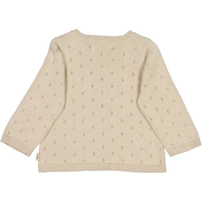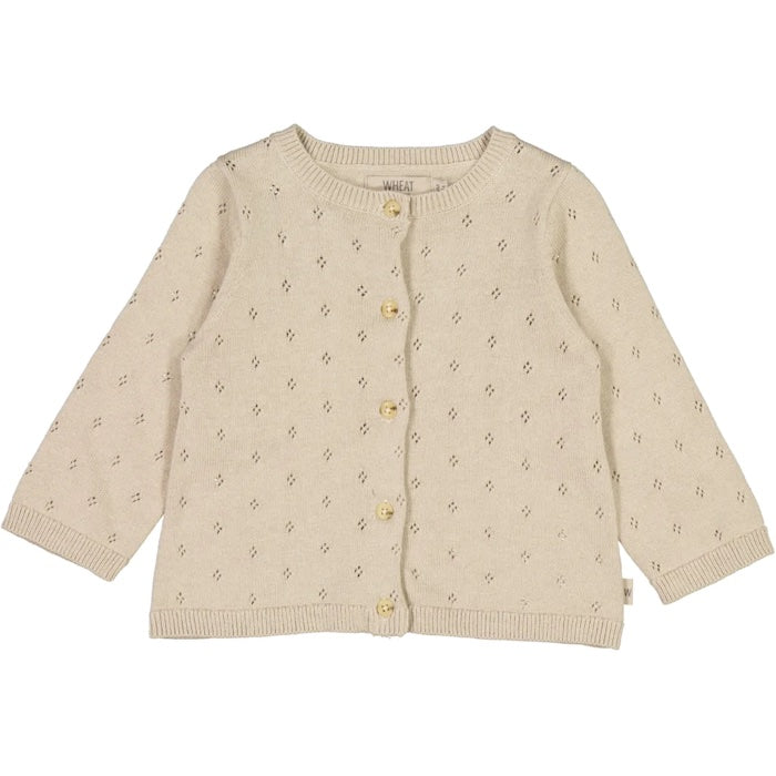 Tolles Strick-Jäckchen mit Pointellemuster - in einem wunderschönen Creme-Ton! Vorne mit durchgehender Knopfleiste. Falls es in den kommenden Herbsttagen etwas kühler wird, sollte man es unbedingt dabei haben.