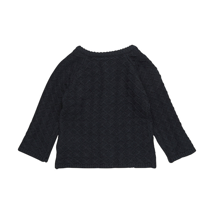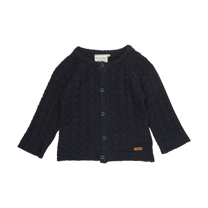 Der Strick-Cardigan aus Wolle in dunkelblau hat ein schönes Wollmuster. Er wärmt perfekt für den Winter.