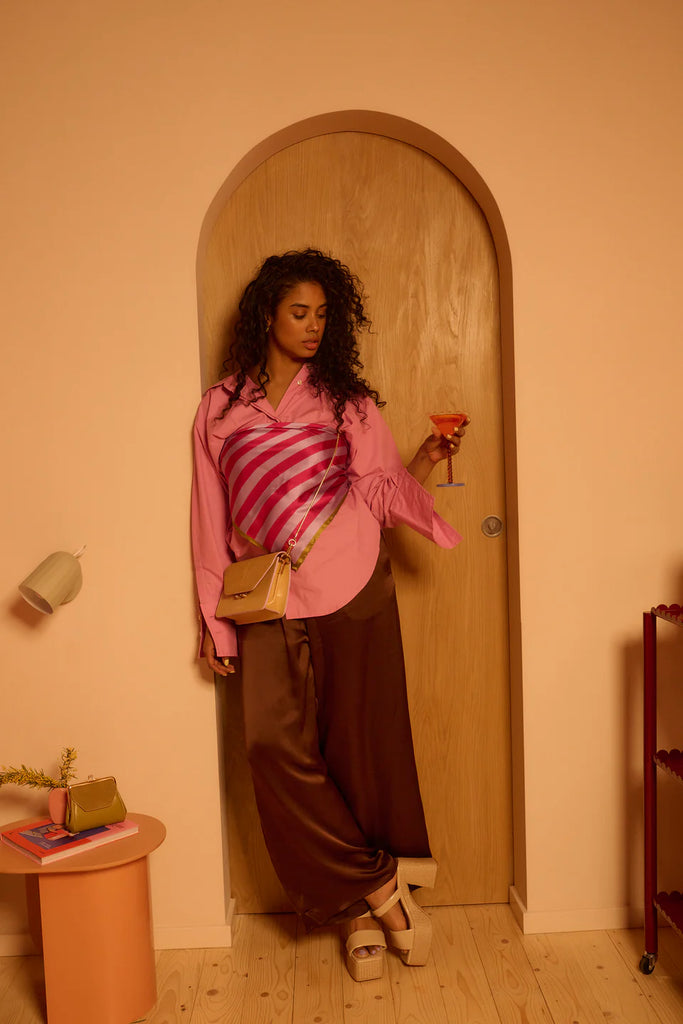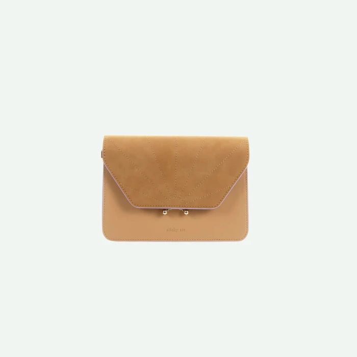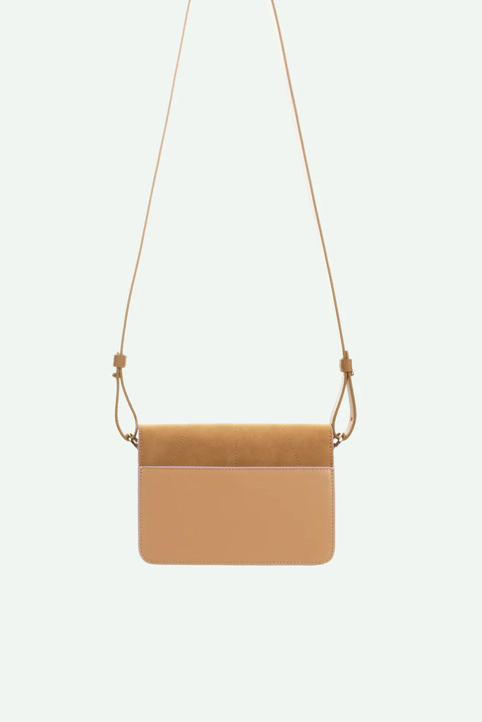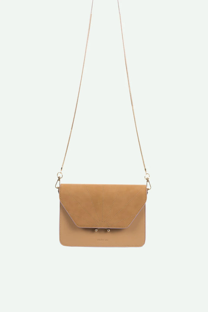 Eine Affogato-beige Umhängetasche mit zwei verschiedenen, abnehmbaren Henkeln: einem verstellbaren Riemen aus veganem Leder und einer goldenen Schlangenkette. Sie haben die Wahl: Möchten Sie einen lässigen, legeren oder einen superschicken Look? Die Tasche ist aus hochwertigem veganem Leder gefertigt und hat eine Klappe aus echtem Wildleder. Das Futter besteht aus coolem und schickem gestreiftem Canvas und der goldene Reißverschluss an der Innenseite ist von YKK. Die Umhängetasche hat zwei Fächer. Jede Tasche wird in einem Staubbeutel geliefert, damit Sie sie bei Nichtgebrauch aufbewahren können.