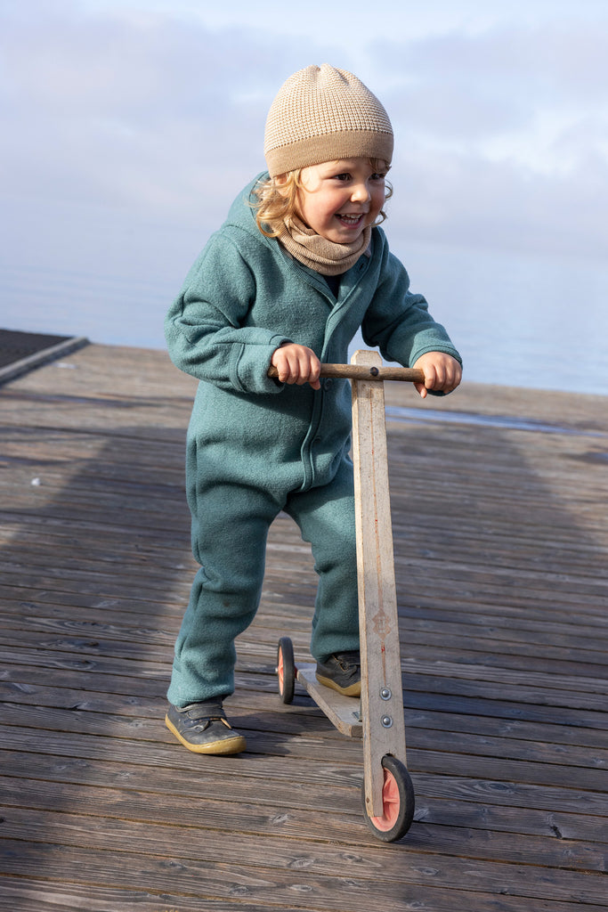 Von Kopf bis Fuß in extra weichem Wollwalk – das ist der disana Walk-Overall. Die umklappbaren Stulpen an Armen und Beinen, die Passform, die schönen großen Steinnußknöpfe. Es sind die vielen Details, die unseren Walk-Overall zu einem ganz besonderen Kleidungsstück machen. Die eingeschlossenen Luftkammern im Walkstoff sorgen für einen einzigartigen Klimakomfort und machen unseren Overall zum idealen Darüber beim Spielen in Kälte und Schnee. Die durchdachte Kapuzenform ist für die Kleinsten noch bequemer zu tragen und schließt am Gesicht besser ab. Kapuze und Hals sind nun mit feiner Bio-Baumwolle gefüttert. So kann an diesen empfindlichen Stellen garantiert nichts kratzen.