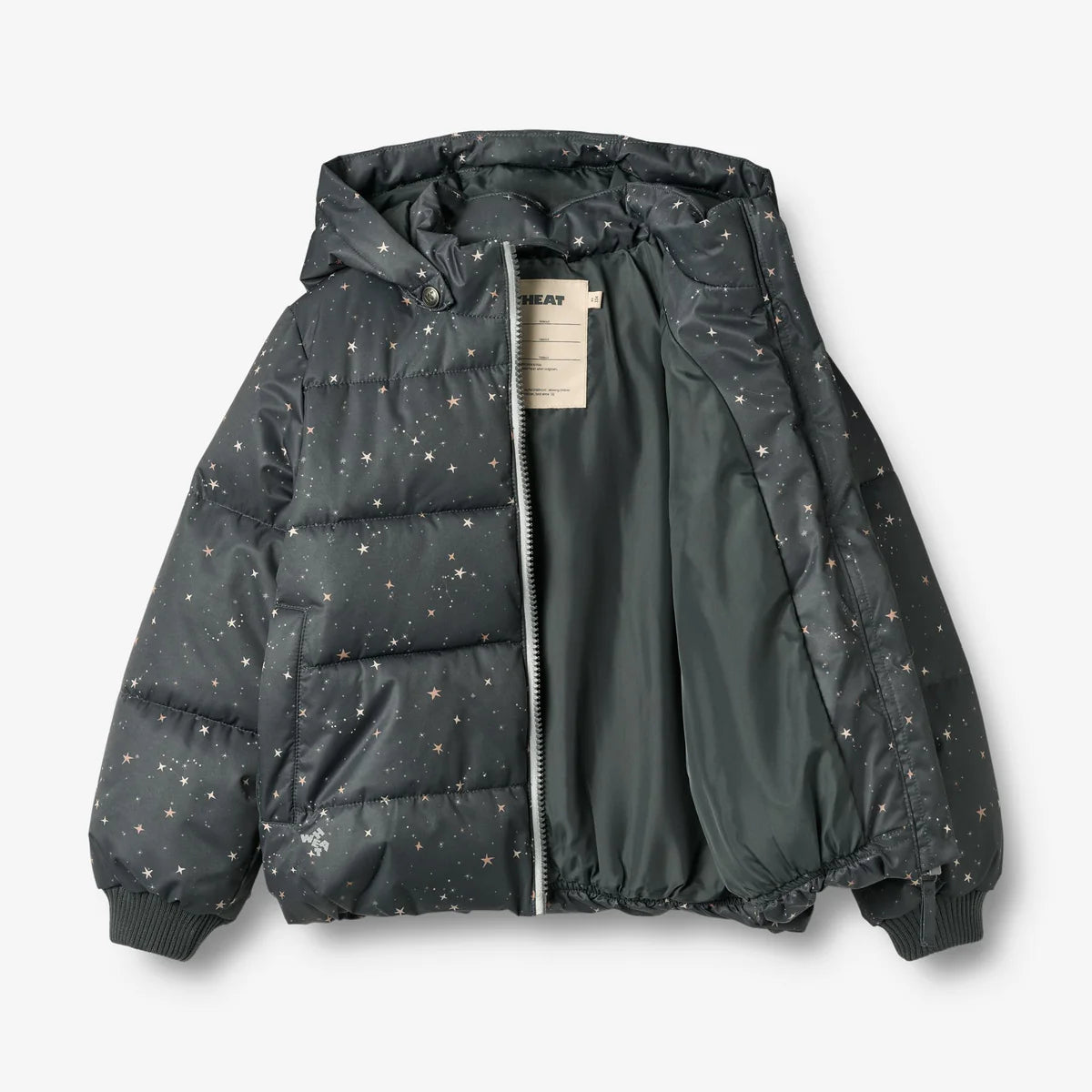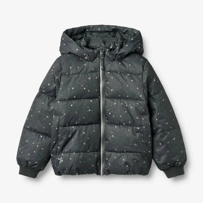 Daunenjacke mit abnehmbarer und verstellbarer Kapuze für Kinder.